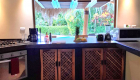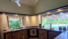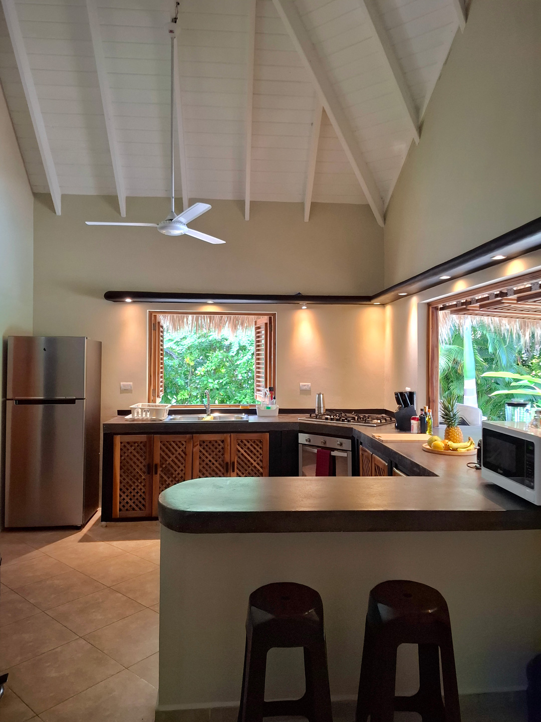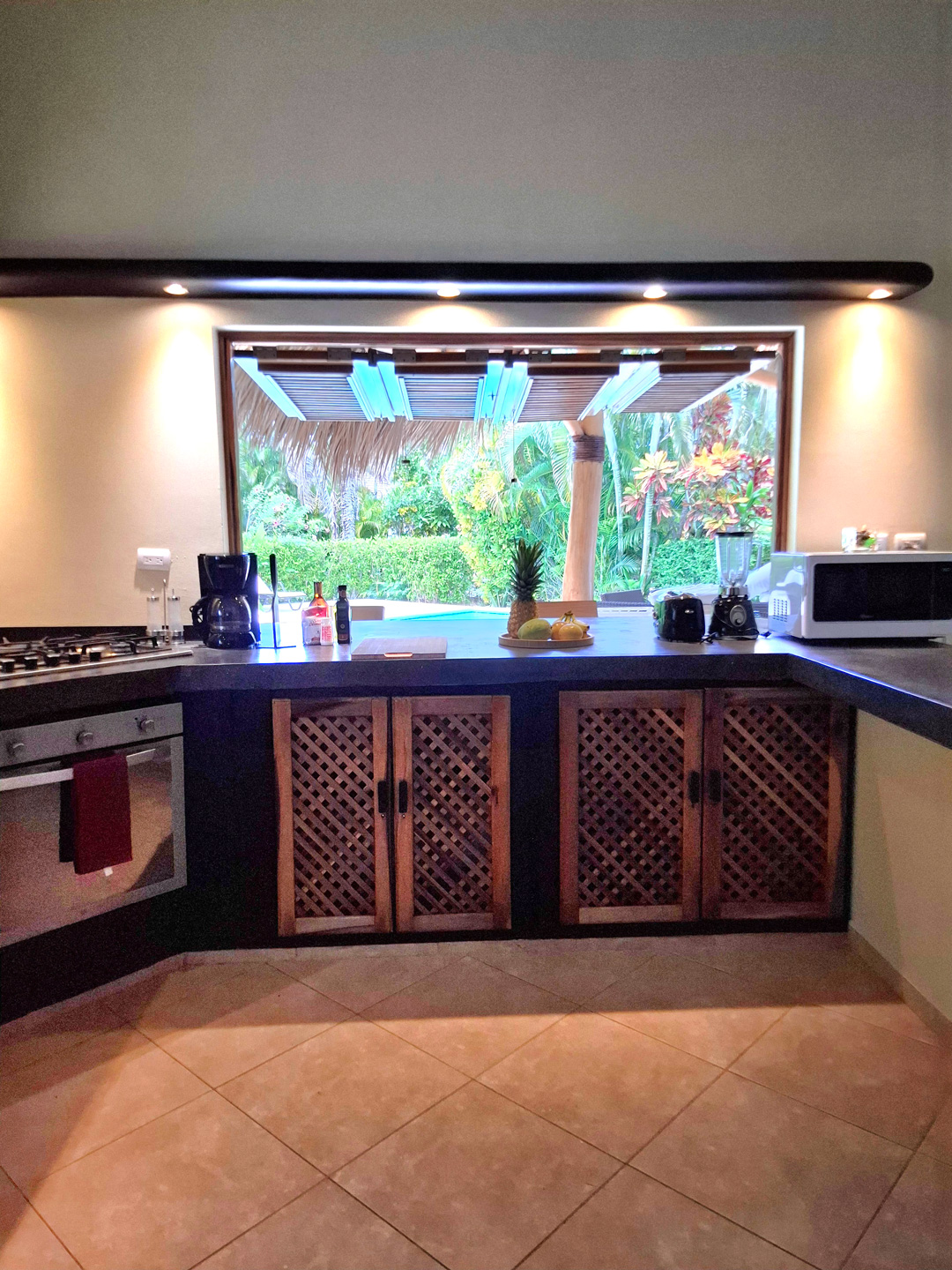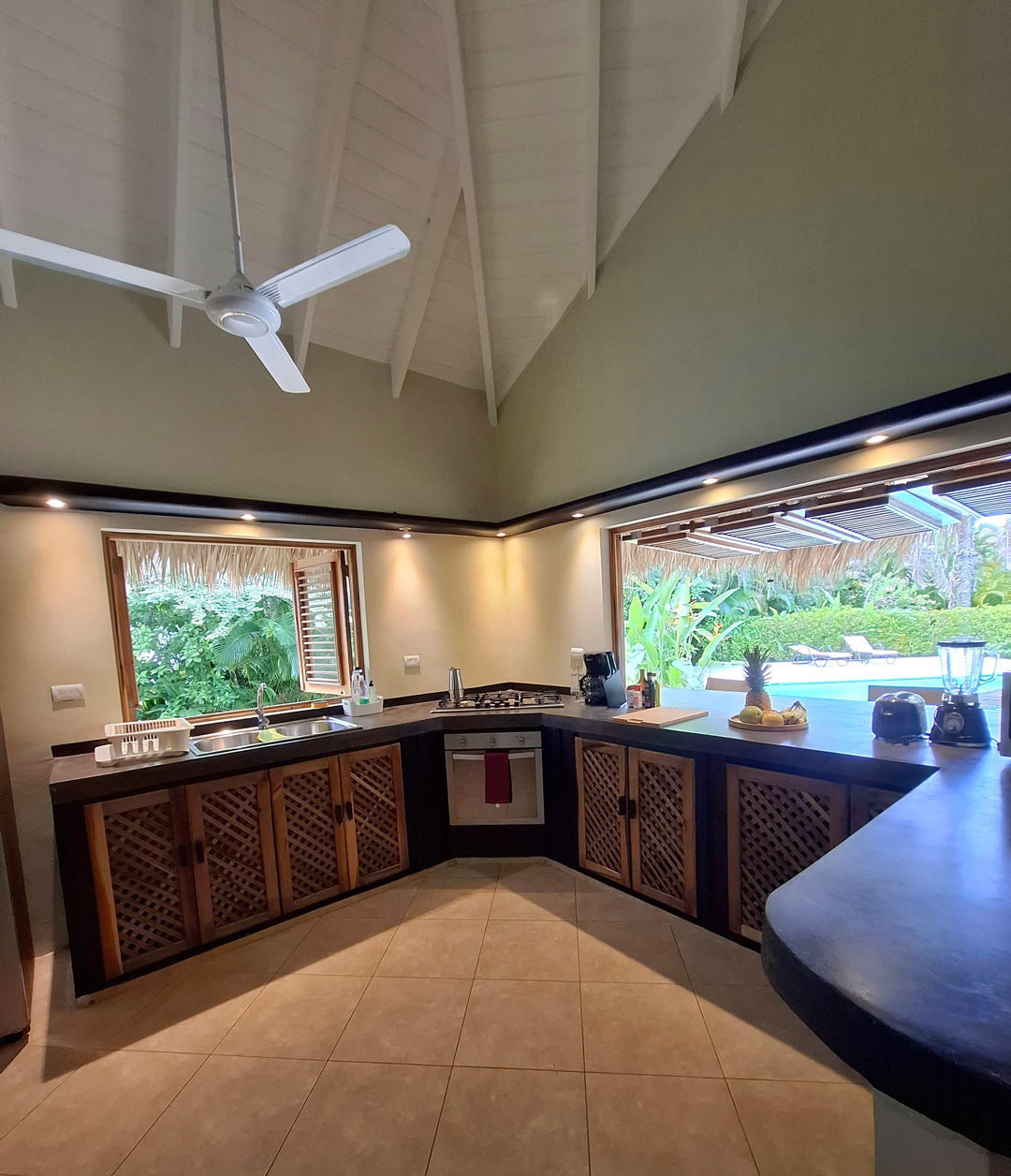 La sala de estar y el comedor se abren por cuatro grandes puertas en la terraza cubierta y en la piscina. Las comidas se pueden tomar en la terraza cubierta. Recientemente se hizo una gran cubierta de coralina al otro lado de la piscina para mejorar la natación y tomar el sol.